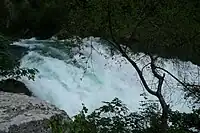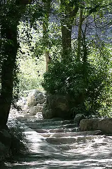 This karstification phenomenon acting on the surface of the impluvium, removes an annual volume of 45 cubic metres (1,600 cu ft) per square kilometre, which disappears after being dissolved in the water.[5] That figure becomes more meaningful when calculations show that, in 3.5 million years, the Vaucluse Mountains, the Albion Plateau, and the Lure Mountain, will have had their thickness reduced by 1,500 metres (4,900 ft).[6]