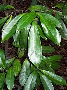 A shrub or small tree to 5 metres tall. Leaves are 6 to 9 cm long and 2 to 3.5 cm wide,[3] alternate on the stem. Reverse ovate or elliptic in shape with a long leaf tip, and narrow wedge shaped at the leaf base. The leaf stalk are between 5 and 21 mm long, swollen at both ends, and somewhat channelled. Small white flowers appear on panicles flowers December to January. The fruit matures in July, being a red fleshy ovate shaped capsule, 2.3 cm in diameter.