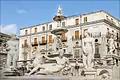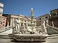 The fountain represents the Twelve Olympians, other mythological figures, animals and the rivers of Palermo.