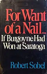For Want of a Nail: If Burgoyne Had Won at Saratoga is an alternate history novel published in 1973 by the American business historian Robert Sobel.[1] The novel depicts an alternate world where the American Revolution was unsuccessful. Although it is fiction, the novel takes the form of a work of nonfiction, specifically an undergraduate-level history of North America from 1763 to 1971. The fictional history includes a full scholarly apparatus, including a bibliography of 475 works and 860 footnotes citing imaginary books and articles; three appendices listing the leaders of the Confederation of North America, the United States of Mexico, and Kramer Associates; an index; a contemporary map of the alternate North America; and a preface thanking imaginary people for their assistance with the book. The book also includes a critique of itself by Professor Frank Dana, an imaginary Mexican historian with two books listed in the bibliography.