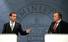 Russian President Dmitry Medvedev and Danish Prime Minister Lars Løkke Rasmussen hold a joint press conference, April 2010.