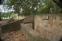The structure is mostly below grade and composed of three sections of concrete walls which range from 8" to 1’ thick and in total measure 184-foot-long (56 m) in length. Sloping from north to south and open on top, the 9.5’ north wall is 3’ higher than the south wall; the structure's width varies among the three sections. The 14’ long eastern section originally had a roof and served as a storage room for target supplies and tools. It had a doorway leading to the 76’ long center section, which essentially served as a walkway between the storage room and the 94’ long target area at the western end. A door opening connects the center and western sections. "May 20th, 1918" is inscribed in the ·south wall of the middle section. [3]