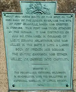 A brass plaque on a stone plinth memorializing the fort's destruction was erected in Lewistown in Mifflin County, Pennsylvania, in 1916 by the Pennsylvania Historical Commission and the Committee on Historical Research of Mifflin County.[17]
