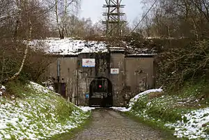 Chaudfontaine's armament was upgraded in the 1930s to become part of the Fortified Position of Liège II, which was planned to deter a German incursion over the nearby border.[10] The armament was upgraded with new guns in the turrets. This was accompanied by improvements to ventilation, protection, sanitary facilities, communications and electrical power. An air intake tower was added overlooking the Vesdre. New barracks were built at this time for peacetime accommodation.[2] A large infantry shelter was constructed on the fort's glacis, intended to be linked to the main fort.[3]