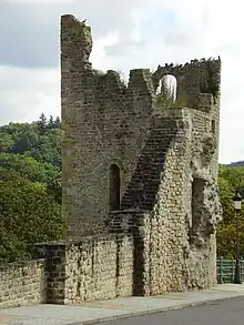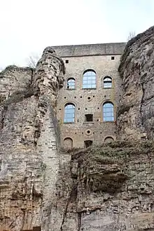 After the Romans had left, the fortification fell into disrepair, until in 963 Count Siegfried of the House of Ardennes acquired the land in exchange for his territories in Feulen near Ettelbrück from St. Maximin's Abbey in Trier.[5] He built a small castle on the Bock promontory, which was connected to the plateau through a drawbridge.[5] In time, a settlement grew on the plateau. Knights and soldiers were billeted here on the rocky outcrop, while artisans and traders settled in the area beneath it, creating the long-standing social distinction between the upper and the lower city. The settlement had grown to a city by the 12th century, when it was protected by a city wall adjacent to the current Rue du Fossé. In the 14th century, a second city wall was built, which also incorporated the land of the Rham Plateau. A third wall later incorporated the urban area as far as today's Boulevard Royal.[6]