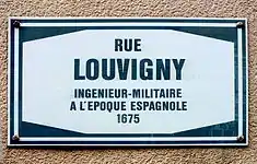 Street sign for Rue Louvigny. The explanation reads "Military engineer in the Spanish period, 1675".