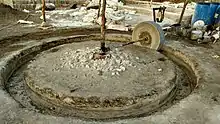 The gates of medieval Indian forts were highly decorated.[9] Two distinct styles are seen. The Hindu style with a lintel , and the Mughal style with an arch. Gates in Indian forts were often high and wide to allow elephants to pass.[10] Often they had rows of sharp, stout iron spikes to dissuade an attacking army from using elephants to break down the gates.[11] Such a gate with spikes can be seen on the Shaniwarwada fort, Pune. The walls of the forts were often looked higher from the outside than the inside as the forts made use of the natural rock formations on hills. This not only gave an illusion of greater height but also lead to the lower walls of the fort to be entirely made up of natural rock providing almost a perfect defense against the use of a battering ram or war elephants to tear down the walls.[12] The main gate to the forts was located mostly facing north direction, this was to avoid its deterioration by the rains, winds and the sun.