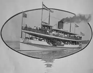 In 1919, Fortuna was reconstructed into a ferry at Captain Anderson’s shipyard at Houghton. Unlike most purpose-built ferries, Fortuna remained a single-ender. Automobiles however could drive right through the once-beautiful steamer. The procedure was for Fortuna to dock bow-on at Roanoke, on Mercer Island, have autos drive on, then back out and head for the Seattle ferry dock at Leschi. On reaching Leschi, to unload the autos, Fortuna had to be turned and backed into the dock. This took great skill by her captain and engineer.[4] Fortuna was ultimately judged too small for her route, and was returned to the county by Captain Anderson's Lake Washington Ferries company.[5]