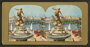 - The Exposition Universelle (1889) which celebrated the 100th anniversary of the French Revolution. featured the Eiffel Tower, and a fountain illuminated by electric lights shining up though the columns of water, a method first developed in England in 1884. The fountains, located in a basin forty meters in diameter, were given color by plates of colored glass inserted over the lamps. The Fountain of Progress gave its show three times each evening, for twenty minutes, with a series of different colours.[3]