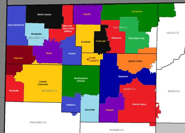 School districts served by Four County Career Center. Four County's location is marked with a maroon square in Archbold's school district.