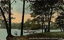 Fox Island is a minor island located in the Charles River in Waltham, Massachusetts. The island is public, uninhabited, and forested. It is owned by the Department of Conservation and Recreation (DCR). Fox Island's name is in conjunction with Fox Park in Waltham, which is just to the west by north of Fox Island, and also owned by the DCR. Fox Island was previously partially owned by Stephen B. Cram circa 1865.[1] In 1891, Harvey Bartlett opened Forest Grove and Fox Island,[2] a getaway that featured a swimming area, bathing houses, a carousel, a dance hall, a refreshment stand, and a bridge from Forest Grove to Fox Island.[3] Bartlett's business was hurt by the opening of nearby Norumbega Park in 1897, but Fox Island remained an attraction for courting couples and daring swimmers.[4]