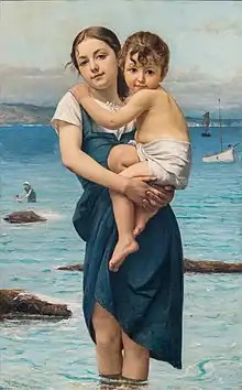 From 1875 until his death, he and his family were regular visitors at the artists' colony in Concarneau, where he had been invited to come by its founder Alfred Guillou and in whose home they sometimes stayed.[1] The soft light of the region inspired him to focus on painting children and young women, generally in peasant scenes. He would often sketch profusely during the summer, then finish the painting during the winter at his Paris studio. Most of his models came from the Concarneau region.[3]