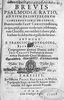 - Brevis psalmodiæ ratio, ad usum presbyterorum Congregationis Oratorii... authore P. Francisco Bourgoing. Paris: Pierre I Ballard, 1634. 8°. Read on Gallica. Guillo 2003 n° 1634-B, Mariolle 1997 n° 3, RISM B-VI p. 173.