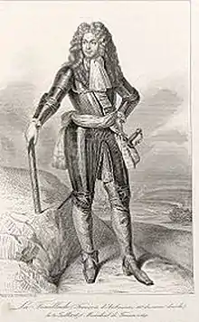 During the 1667–1668 War of Devolution with Spain, de la Feuillade was in the army under de Rochebaron that captured the towns of Bergues, Veurne and Courtrai/Kortrijk between June and July.[7] When it ended, he was part of a French expeditionary force sent to the Venetian-occupied island of Crete, which had been besieged by the Ottomans since 1648; French troops were withdrawn in August 1669, shortly before the island surrendered in September.[8] He was appointed Colonel of the Gardes Francaises when the Franco-Dutch War began in 1672, he fought in the Netherlands and various other theatres, including Franche-Comté in 1674, when he led an assault during the Siege of Besançon and took Salins-les-Bains on 22 June.[9] He was rewarded by being made Marshal of France in 1675 and military Governor of Dole, regional capital of Franche-Comté until it moved to Besançon in 1676.[10]