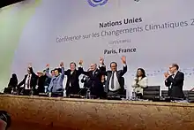 One issue France is extremely active in within the UN is environmental justice and climate change. France hosted the 2015 UN Paris Climate Conference or COP21[22][23] and played a driving role in developing and enacting the Paris Climate Agreement. Beyond specifically climate change, France is also leading the fight for international environmental law, working with experts from 40 countries from around the world in different stages of development and presenting the “Global Pact for the Environment” to the UN.[24] A resolution was adopted by the General Assembly on 10 May 2018.[25]