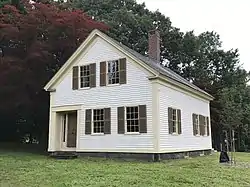 The Drake House is located southwest of downtown Leominster, on the north side of Franklin Street, on a lot that extends between the street and Monoosnoc Brook, the principal source of water power for the city's 19th-century industries. It is a 1+1⁄2-story wood-frame structure, with a gabled roof and clapboarded exterior. The front facade is three bays wide on the ground floor, with the entrance in the left bay. It is set in a recess with sidelight windows; the outside of the recess is framed by post and lintel moulding. The front-facing gable has frieze bands along the raking edges, and corner returns. The interior of the house retains a number of original features, while others have been restored. The most unusual feature is a trapdoor in the front parlor, which provides access to the house's full basement. This trapdoor was apparently built at the same time as the floor, and is thus an original feature created by the house builder, Jonathan Drake.[2] A Victorian porch, probably added in the late 19th century, has been removed during restoration of the property. The house, now owned by the city, underwent a major rehabilition in the 2010s, to return it to its appearance in the 1850s.[3]