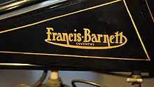 The Lea Francis cycle and motorcycle business had been formed by Graham Francis and R.H. Lea in 1895,[3][4] who was the son of Graham Francis who manufactured motorcycles under the name 'Lea Francis', went into partnership with Arthur Barnett to create Francis & Barnett Limited. Gordon married a lady whose father was Arthur Barnett and already producing Invicta motorcycles.[5] Both Francis and Barnett both related by marriage started in the same company's workshop as that of Bayliss Thomas and Company Limited in Lower Ford Street, Coventry, established in 1874, who produced the Excelsior model. They were reformed as the Excelsior Motor Cycle Company in 1909. Photograph of Excelsior No1 Works, Bayliss Thomas and Company taken outside the works before 1909 - this is the same works that Francis-Barnett move into.[6][7] The first English motorcycle produced which continued until 1965. At first Francis Barnett machines were little more than re-badged Invicta motor cycles.[8] During the 1920s Francis Barnett made supple sheet metal work and pressings for the motor industry that proved successful. In 1947 Francis Barnett took over Clarendon Pressings and Welding Company Limited. In 1948 Output was increased and Industrial trolleys and pressed fabricated parts for the motor industry were made.[9][10] Photographs and story of Clarendon Pressings and Welding Company, in Clarendon Street, Earlsdon, Coventry.[11]
