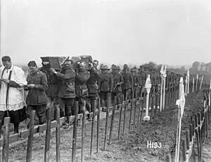 Johnston is buried on the edge of Bailleul, in the Bailleul Communal Cemetery Extension. His grave is close to that of Brigadier-General Charles Henry Brown, Johnston's successor as commander of the 1st Infantry Brigade, who had been killed just a few weeks previously.[19][20] Johnston was survived by his second wife, Alice Seaton, who he had married several months before his death.[21]
