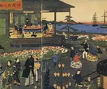 Detail from Hiroshige II Print showing Walsh Hall & Co. Garden in Yokohama with George R. Hall's plants about to be sent to the U.S.
