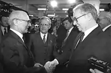Meehan shaking hands with East Germany's leader Erich Honecker in 1987.