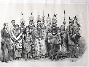 George Catlin's 1844 illustration of Ioway in Europe, Francis White Cloud is front center right; Jeffrey Deroine is second from left.