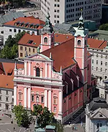 The Franciscan Church of the Annunciation (Slovene: frančiškanska cerkev Marijinega oznanjenja or commonly Frančiškanska cerkev; officially Cerkev Marijinega oznanjenja) is a Franciscan church located on Prešeren Square in Ljubljana, the capital of Slovenia. It is the parish church of Ljubljana - Annunciation Parish. It was built on a site where two or possibly three churches stood earlier between 1646 and 1660 (the bell towers following around 1720) under the management of Francesco Olivieri and Francesco Rosina, and its exterior was redesigned in 1858 according to plans by Franz Kurz zum Thurn und Goldenstein. The frescoes in the interior were added in the mid-19th century by Matevž Langus and on the ceiling by Matej Sternen in the first half of the 20th century, whereas the main altar was mostly made by the Baroque sculptor Francesco Robba (1736). The red or pink colour of the church is symbolic of the Franciscan monastic order.[1][2][3] Since 2008, the church has been protected as a cultural monument of national significance of Slovenia.[4]