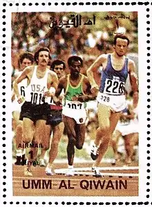 Shorter achieved his greatest recognition in the marathon, and he is the only American athlete to win two medals in the Olympic marathon.[13] At the Munich Games—which coincidentally is Shorter's place of birth— he finished fifth in the 10,000-meter final, breaking the American record for the event that he had established in his qualifying heat.[8] A few days later, he won the gold medal in the marathon. This ultimate achievement was marred by an impostor, West German student Norbert Sudhaus,[14] who ran into Olympic Stadium ahead of Shorter. Shorter was not bothered by the silence from the crowd who had been duped into thinking that he was running for the silver medal. Shorter was confident that he was going to win the gold medal because he knew that no competing runner had passed him.[15] He received the James E. Sullivan Award afterwards as the top amateur athlete in the United States.[8] At the 1976 Summer Olympics in Montreal, Shorter dropped out of the 10,000 meters in order to concentrate exclusively on the marathon, winning the silver medal in the marathon[8] and finishing behind previously unheralded Waldemar Cierpinski of East Germany.[16] Cierpinski was later implicated as a part of the state-sponsored doping program by East German track and field research files uncovered by Werner Franke at the Stasi headquarters in Leipzig in the late 1990s. There were suspicions about other East German athletes during the Montreal Olympics, including the East German women's swimming team led by Kornelia Ender; the East German women won eleven of the thirteen events.[17]