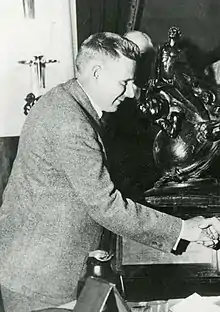 ![]() Frank W. Caldwell being congratulated on winning the 1933 Collier Trophy (visible in the background) for his work with Hamilton Standard on the controllable-pitch propeller.[1] | |
