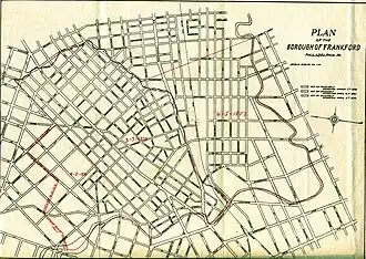 The village was incorporated into a borough on March 2, 1800, bounded by Leiper Street on the northwest, Little Tacony (or Tackawanna) Creek on the south and east, and Frankford Creek on the west.[4] By an act on April 4, 1831, the boundaries of the borough were extended to include land to the northwest of Leiper Street, the line running along Harrison and Horrocks Streets, to a point on Frankford Creek below Wyoming Avenue.[4] In 1853, the part of Whitehall Borough lying between Torresdale and Frankford Avenues below what is now Whitehall Common was added, to encompass a total of 1.468 square miles.[4] In 1854, the borough was annexed by the city of Philadelphia through the Act of Consolidation, 1854.