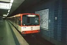 The U2 Class were the first production vehicles for the network. Duewag built 97 vehicles of this type in three batches from 1968 to 1978. A fire at the depot in 1980 destroyed five sets and were replaced with seven replica sets in 1984. They were painted in a red and white livery and used from 1968 to 2016. A variant, the U2h, features a lower boarding height than the regular U2, and was in use until 2013.