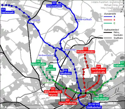 Frankfurt U-Bahn network map showing Sections A, B, C.