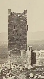 The archaeologist Kyriakos Pittakis was an early advocate of demolition, while foreign visitors labelled the tower a "barbarous sentinel" and complained that it interrupted the view of the Parthenon.[2] In the Greek press, the architect and academic Lysandros Kaftanzoglou compared the tower, which he considered of Turkish origin and called "barbarian", with "the droppings of birds of prey".[24] Kaftanzoglou's later work repairing some of the Acropolis's retaining walls, in which he boasted that "no deviation from the ancient line was effected nor use of alien material", has been described as a manifestation of the classicising ideology behind the demolition of the Frankish Tower, and much of the subsequent restoration work on the Acropolis throughout the nineteenth century.[25]