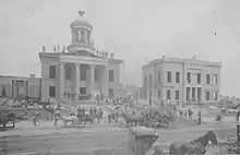 A fire destroyed many records in this courthouse in 1879, prompting discussion of a new courthouse building.[4] In 1882, a Columbus Dispatch editorial urged construction of a new courthouse, detailing that the then-current structures were "inadequate in every way". The writer found the buildings to be small, impossible to clean, and with bad ventilation, among other issues.[5] The 1887 Franklin County Courthouse was built on its site from 1884 to 1887.[6]