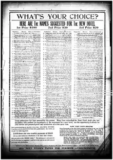 Page from a 1919 Kent Courier with some of the submitted name suggestions for the hotel