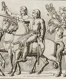 Michel Ney's VI Corps smashed Riesch on 14 October in the Battle of Elchingen and forced the survivors to retreat to Ulm.[18] Murat set out in pursuit of Werneck. On 16 October, there was a clash between Ney's cavalry and Prince Friedrich Franz Xaver of Hohenzollern-Hechingen's division at Langenau. Murat caught a 5,000-man brigade under Rudolf Sinzendorf at Herbrechtingen on 17 October and wiped out half of it.[19] On the same day, Ferdinand's cavalry fought off the French cavalry at Nördlingen,[20] and there was another clash with Werneck's troops at Neresheim. Murat and Ney with 28,000 troops cornered their adversary at Treuchtlingen[note 1] on 19 October. On that day Werneck capitulated with 15,000 troops, 28 guns, 12 colors, two standards, and four generals. Murat demanded that the terms include nearby Austrian units and Werneck accepted. Because of this the artillery reserve also surrendered. Hohenzollern refused to join in the capitulation and got away with 10 squadrons of cavalry. Ferdinand also managed to escape to Bohemia with Karl Philipp, Prince of Schwarzenberg and 12 squadrons of horsemen.[21] On 20 October Mack surrendered at Ulm[22] with 20,000 infantry, over 3,000 cavalry, and 59 guns.[19]