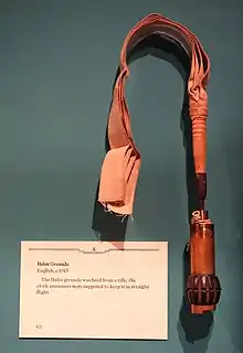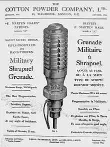 With little War Office interest in the field in the pre-war years Hale came to dominate grenade development. He was granted 11 patents for hand grenades and rifle grenades between 1906 and the start of the First World War.[3]:38 He developed the Hales rifle grenade in 1908 and marketed it widely, demonstrating the weapon to representatives from 18 countries including France, Germany, Russia, Mexico and Spain.[3]:38[1] It was dismissed by the chief draftsman at the Woolwich Arsenal as "a crazy and audacious monstrosity" that was likely to burst rifle barrels.[4] Hale sold a number of grenades to Germany in 1911 but they were not selected for service.[3]:38 He exported the rifle grenade to government of Mexico where they were used during the Mexican Revolution, and to Brazil leading to an association of the weapon with suppression of disorder and with colonial warfare.[3]:38[5] By 1911 Hale had modified the grenade to incorporate a wind vane.[3]:108 The grenade would not detonate unless the wind vane was activated by flight, avoiding the danger of a grenade detonating in front of the user after falling off the rifle.[6]
