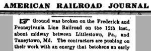 27. "Frederick and Pennsylvania Line Breaks ground". American Railroad Journal. 43: 93. 22 January 1870. Retrieved 24 May 2019. The March 5th paper, page 279 gave the report of the June 1871 completion.