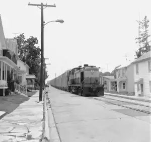 Central Railroad of Maryland on Farquhar St, Union Bridge MD in 1984 and Maryland Midland train by Charlie Hill