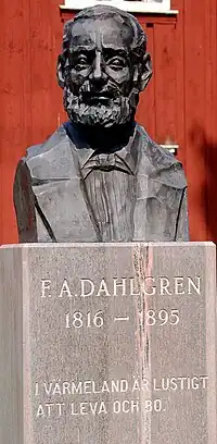Dahlgren is best remembered for writing two popular Swedish folk songs. Together with Anders Fryxell (1795–1881), he wrote the lyrics to "Ack Värmeland, du sköna". He wrote the lyrics for the Värmland folk song "Jänta å ja".[2] Dahlgren also wrote the text for the musical drama Värmlänningarna with music by composer Andreas Randel (1806–1864).[3][4][5][6]