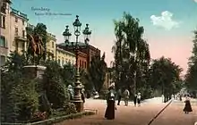 Originally its shape was a large rectangular square, with streets dividing it into four quarters. In 1873, the southern part of the square was used for the construction of the Lutheran church of St Peter's and St Paul. On 17 September 1893 a statue of Emperor Wilhelm I on horseback was erected in the center of the square:[1] it was erected "in memoriam" of the deceased emperor, as a tribute to the creator of the German Reich and the father of the nation.[3] The monument was funded partly by the city, partly by donation from wealthy citizens, like among others, Lewin Louis Aronsohn or Heinrich Dietz.[3] This monument was short lived: after Bydgoszcz returned to Polish territory in 1919, the statue was dismantled and moved to the city of Meseritz (Międzyrzecz).[4]