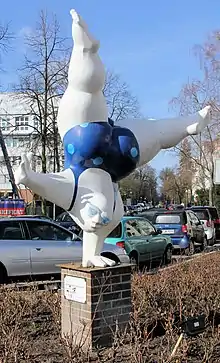For four weeks each year, between April and June, the FBK organizers opened the doors of the exhibition halls at the Funkturm Berlin and invited the public. “Drawings, pictures, spatial as well as sound and video installations, sculptures, collages, photography” were presented.[15] In addition to depressive performances,[19] there were also humorous inventions, such as a potency automat (1986)[20] or an art licensing machine(1989).[21] Over the years, not only the exhibition itself, but also the accompanying program developed. Prints and small sculptures were sold in a bazaar. On Saturdays there were guided tours. A traditional breakfast with jazz music and discussions enjoyed increasing popularity. A Kinderatelier (children's art room) was open daily where children, guided by artists, could paint. While the program changed at times, there were special readings by women, or “music played on historical instruments”.[22] The exhibition management was also interested in the outer appearance of the exhibition halls. A proposal for a flag project was repeatedly turned down by the Senate. Eventually the artists financed the project at their own expense. In 1989 “the visitors of the 19th FBK were greeted at the entrance to the exhibition halls by 70 colourful flags [...], which had never been shown before”.[23] In 1991, as in previous years, a “graphic competition for students of the Berlin University of the Arts” was organized.[13] In 1992, the project began with picture panels, 30 large-format paintings on the outside of the exhibition halls, designed to “catch the eye”.[15] For the first time in 1993, art discussions were held in which artists and visitors alike participated. They took place every day, with the aim to encourage “thinking with one's eyes”.[24] A five-minute-long video, published on YouTube on October 5, 2010, highlights events of the 19th FBK. It provides an impression of the atmosphere typical of the exhibitions.[21]