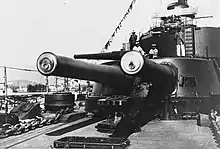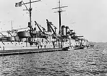 The following year, she became a gunnery training ship at Toulon,[4] but she suffered a serious boiler fire on 6 June 1923 that required repairs, so she was given the first of her modernisations between 9 July 1923 and 16 April 1924, at La Seyne-sur-Mer. This included replacing four boilers with oil-fired du Temple boilers and trunking together her two forward funnels. The maximum elevation of the main armament was increased from 12° to 23° which increased their maximum range to 26,000 metres (28,000 yd). Her existing AA guns were replaced with four 75 mm Modèle 1918 AA guns, and her bow armour was removed to make her more seaworthy. A new tripod foremast with a fire-control position at its top was fitted. A Barr & Stroud 4.57-metre (15 ft) rangefinder was positioned on the roof of the fire-control position and an experimental Barr & Stroud FX2 7.6-metre (24 ft 11 in) coincidence rangefinder was installed on the roof of the aft superfiring turret, replacing the 2-metre (6 ft 7 in) instrument inside the turret. She had another boiler fire on 1 August 1924, burning 13 men, of whom 3 later died of their wounds, and remained under repair for the rest of the year.[17]