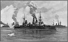 Démocratie was laid down at the Arsenal de Brest shipyard on 1 May 1903, launched on 30 April 1904, and completed on 9 January 1908,[4] over a year after the revolutionary British battleship HMS Dreadnought entered service, which rendered the pre-dreadnoughts like Démocratie outdated before they were completed.[5] Following her completion, she left Brest on 20 January and steamed south to Toulon, where she joined the 1st Division of the 1st Battle Squadron on 10 March, which included the battleships Patrie and République. In June and July, the Mediterranean and Northern Squadrons conducted their annual maneuvers, this time off Bizerte. In October, the 1st Division ships steamed to Barcelona, Spain, but Démocratie did not join her division mates, since the French government feared her name would be provocative to the Spanish King Alfonso XIII.[6]