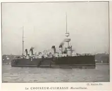 Marseillaise, named after the French national anthem,[7] was authorized in the 1898 Naval Program and was ordered from the Arsenal de Brest on 19 June 1899. The ship was laid down on 10 January 1900, launched on 14 July 1900, and completed in October 1903.[8] The cost of her construction was 22,031,750 francs. Marseillaise was initially assigned to the 1st Cruiser Division (1re Division de croiseurs) of the Northern Squadron. The ship carried President of France Emile Loubet to Naples, Italy, for a state visit in April 1904 and was then transferred to the Light Squadron (Escadre légère) of the Mediterranean Squadron in October. By September 1905, she was flagship of Rear Admiral (Contre-amiral) Paul Campion, commander of the squadron, and remained as such until she was briefly placed in reserve in July 1907.[9]