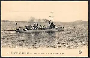 Aspirante Herber was built by Arsenal de Lorient and was launched on 30 April 1912. She was completed in August 1912.[4] When the First World War began in August 1914, Aspirant Herber was assigned to the 2nd Destroyer Flotilla (2e escadrille de torpilleurs) of the 1st Naval Army (1ère Armée Navale). During the preliminary stages of the Battle of Antivari, Montenegro, on 16 August, the 1st, 4th and 5th Destroyer Flotillas were tasked to escort the core of the 1st Naval Army while the 2nd, 3rd and 6th Flotillas escorted the armored cruisers of the 2nd Light Squadron (2e escadre légère) and two British cruisers. After reuniting both groups and spotting the Austro-Hungarian protected cruiser SMS Zenta and the destroyer SMS Ulan, the French destroyers played no role in sinking the cruiser, although the 4th Flotilla was sent on an unsuccessful pursuit of Ulan. Having broken the Austro-Hungarian blockade of Antivari (now known as Bar), Vice-Admiral (Vice-amiral) Augustin Boué de Lapeyrère, commander of the 1st Naval Army, decided to ferry troops and supplies to the port, escorted by the 2nd Light Squadron and the 1st and 6th Destroyer Flotillas while the rest of the 1st Naval Army bombarded the Austro-Hungarian naval base at Cattaro, Montenegro, on 1 September. Four days later, the fleet covered the evacuation of Danilo, Crown Prince of Montenegro to the Greek island of Corfu. The 2nd Flotilla bombarded Stončica Lighthouse on the island of Lissa on 19 September. The flotilla escorted multiple small convoys loaded with supplies and equipment to Antivari, beginning in October and lasting for the rest of the year, always covered by the larger ships of the Naval Army in futile attempts to lure the Austro-Hungarian fleet into battle. The Naval Army raided Lissa and the island of Lastovo on 2 November with the destroyer Lansquenet entering Vis harbor and extorting a ransom from the townsmen lest the French bombard the town. As they departed, the French shelled the lighthouse again.[5]