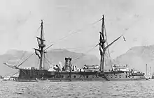 On 20 March 1889, Duguesclin was placed in full commission for active service for the first time, to be assigned to the Eastern Mediterranean and Levant Squadron. She joined the unit three days later, and remained active with it through 1892.[7] During this period, the ship routinely returned to French waters to take part in annual training exercises with the rest of the fleet. Duguesclin served in the 3rd Division of the Mediterranean Squadron in 1890, along with her sister ship Vauban and the ironclad Bayard. She took part in the annual fleet maneuvers that year in company with her division-mates and six other ironclads, along with numerous smaller craft. Duguesclin served as part of the simulated enemy force during the maneuvers, which lasted from 30 June to 6 July.[9] During the 1890 fleet maneuvers, the ship was transferred to the 4th Division of the 2nd Squadron of the Mediterranean Fleet, along with Duguesclin and Bayard. The ships concentrated off Oran, French Algeria on 22 June and then proceeded to Brest, France, arriving there on 2 July for combined operations with the ships of the Northern Squadron. The exercises began four days later and concluded on 25 July, after which Duguesclin and the rest of the Mediterranean Fleet returned to Toulon.[10]