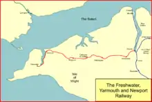 The Freshwater, Yarmouth and Newport Railway was a railway line on the Isle of Wight, United Kingdom, connecting Freshwater and Yarmouth to Newport. It was intended to connect the thinly populated west of the island, and it opened in 1889. At Newport it relied on the existing Isle of Wight Central Railway's station, but trains entering it had to shunt back from the junction. The IoWCR worked the line until 1913.