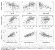 Freshwater phytoplankton shows a strong correlation with both surface area and depth of the water body they inhabit. Species richness increases in larger lakes with surface area and decreases in deeper lakes. Decreases due to depth are associated with lower chlorophyll α concentrations.