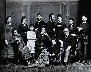 Freud family portrait, 1876 - standing left to right: Paula, Anna, an unidentified girl in a white dress, Sigmund, Emmanuel, Rosa, Marie, and their cousin Simon Nathanson; seated left to right: Adolfine, Amalia, an unidentified boy seated on the floor, Alexander in small chair, and Jacob Freud