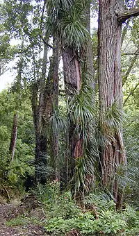 Freycinetia arborea, ʻIeʻie, is a densely branched, brittle, woody climber in the family Pandanaceae, endemic to the Pacific Islands. ʻIeʻie is found in moist forest on the Hawaiian, Marquesas, Austral, Society, and Cook Islands. It grows into the forest canopy, attaching itself to a host tree using aerial roots.[2] It may also grow as a sprawling tangle on the forest floor.[3] The shiny green leaves have pointed ends and are spiny on the lower side of the midrib and along the edges.[4] Leaves measure 40–80 centimetres (16–31 in) long and 1–3 centimetres (0.39–1.18 in) wide, and are spirally arranged around the ends of branches. Flowers form on spike-like inflorescences at the end of branches, and are either staminate or pistillate. Staminate spikes are yellowish-white and up to 10 centimetres (3.9 in) in length. Pistillate spikes are 3–4 centimetres (1.2–1.6 in) but elongate to 7.5–9.5 centimetres (3.0–3.7 in) once fruit are produced. Three to four spikes are surrounded by orange-salmon bracts. Fruit is 1 centimetre (0.39 in) long and contains many 1.5-millimetre (0.059 in) seeds.[2] The bracts and fruit of the ʻieʻie were a favorite food of the ʻōʻū (Psittirostra psittacea), an extinct Hawaiian honeycreeper that was formerly a principal seed dispersal vector for plants with small seeded, fleshy fruits in low elevation forests.[5] It is also a favored food of the ʻalalā (Corvus hawaiiensis), which is currently extinct in the wild.[6]